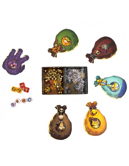 Contenu : 60 diamants, 50 pépites d’or, 5 sacs Aventuriers, 1 main du Troll, 8 dés et la règle du jeu.