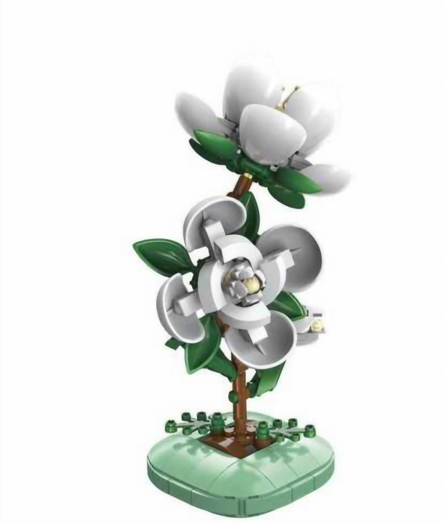 Le coffret est composé de 301 pièces permettant de construire une plante composée de fleurs blanches aux feuilles vertes et aux tiges brunes qui poussent dans un pot.